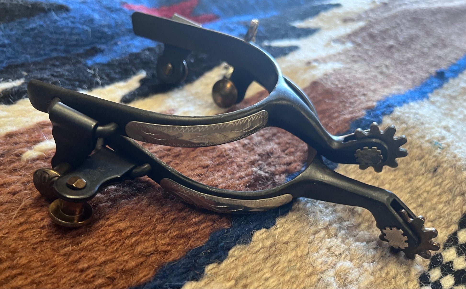 These spurs showcase an engraved German silver overlay on durable black steel, offering a sophisticated look combined with practical strength. Expertly designed, they perform well for both showmanship and everyday work.